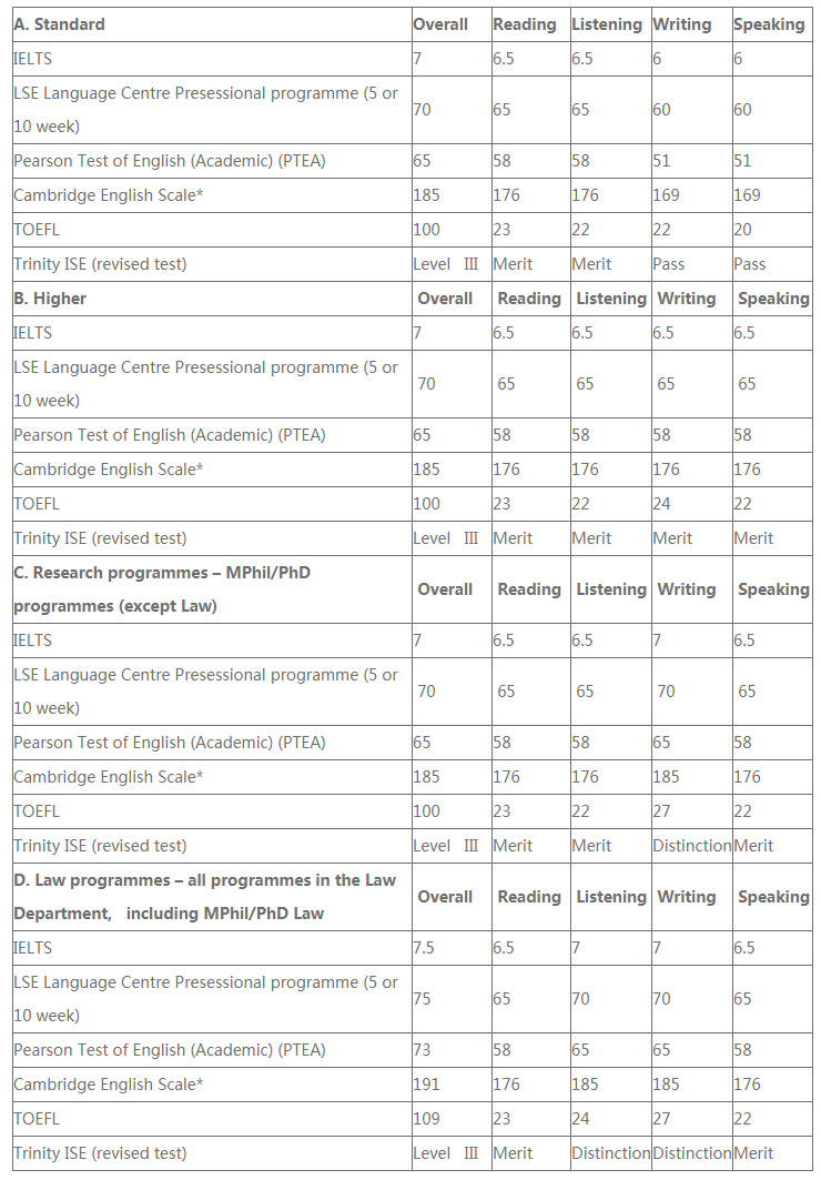 以下列出了伦敦政治经济学院的英语语言能力的一般入学要求和高等入学要求,你必须核对自己所申请的课程需要达到什么等级的英语水平。研究型硕士学位课程以及法学院的语言要求较高。