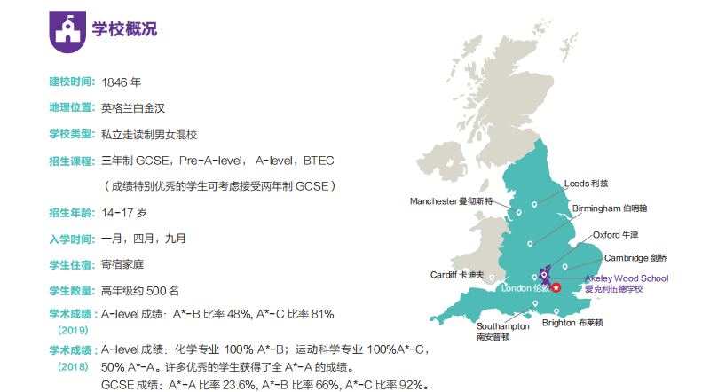 学校环境非常优美,曾是牛津大学一个学院的分校区,全部都是古典的有四百多年历史的维多利亚时代的建筑,是英国最优雅的校园之一。目前隶属于最大的教育投资集团Cognita,其主席 Mr Chris Woodhead 是英国前教育大臣首席视察官。集团刚刚投资对学校设施及教室进行装修维护,学校硬件设施齐全,崭新漂亮。爱克利伍德学校人文关怀度极高,学校有一位拥有十多年国际学生教育经验的老师亲自负责国际学生的各种事物,不仅跟踪学生的学业进度,同时像家长一样密切关注学生的综合成长,随时给予必要的疏通和指导,深受学生爱戴。学校学术成绩斐然,针对国际学生专门设有英文辅导课程,根据学生的实际需求设计课程内容和课时,再结合英语环境,有效地提高学生的英语水平,一月及九月均可申请入学。在过去的十年内,爱克利伍德学校的毕业生去向包括牛津大学、剑桥大学、伦敦政治经济学院和其他享有名望的罗素集团名校。